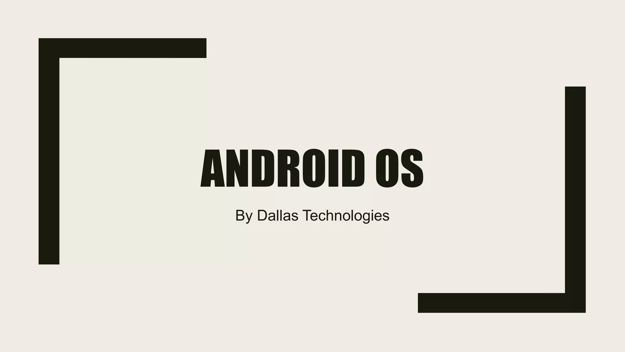 The document outlines the history and evolution of the Android operating system from its acquisition by Google in 2005 through the release of various versions. Key features include its architecture based on Linux and applications developed in Java or Python using the Android SDK. It also provides information about Dallas Technologies, which offers software consulting and training in various technological areas.