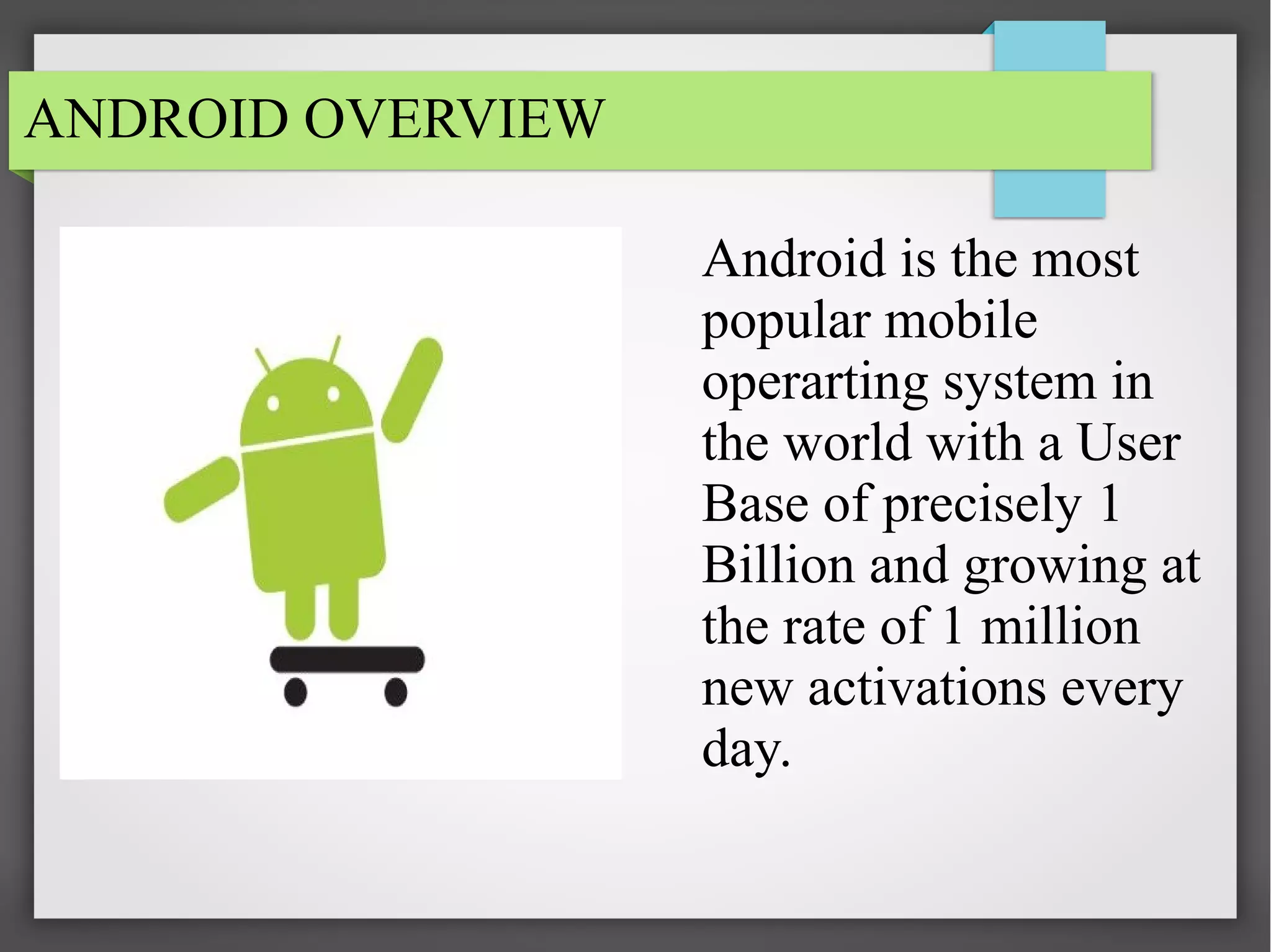 Android is the most popular mobile operating system with over 1 billion users worldwide. It was developed by Android Inc, which was acquired by Google in 2005. Android is an open source platform that runs on many device types beyond just phones, with the goal of a unified platform across all mobile devices. It uses Linux at its core, and includes components like activities, intents, services, and broadcast receivers to define its application framework.
