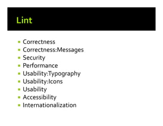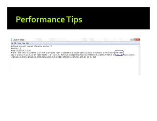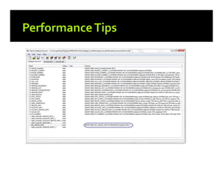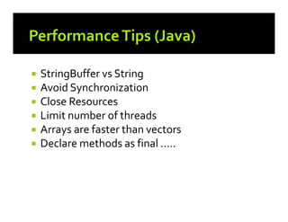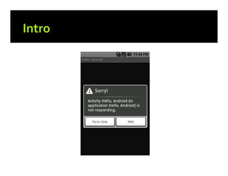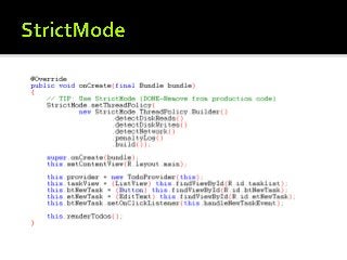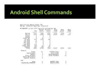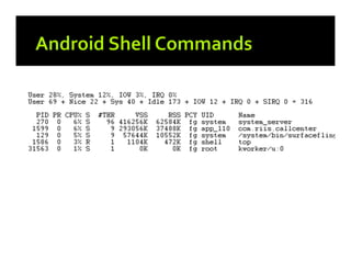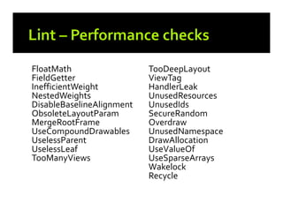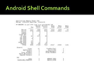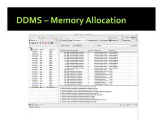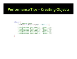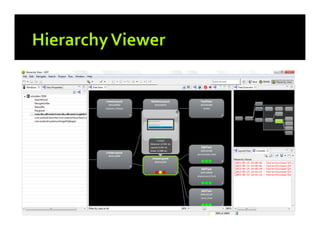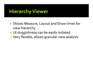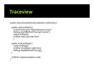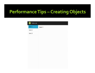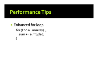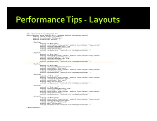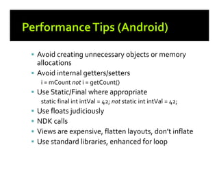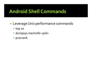 This document provides tips and resources for optimizing Android application performance. It discusses rules for program optimization, metrics for measuring web performance, avoiding unnecessary objects and memory allocations, using views judiciously, and profiling tools like DDMS, Systrace, and Calabash for identifying issues. Specific techniques are recommended for SQLite, web services, and leveraging Unix commands. A list of online resources is also included.