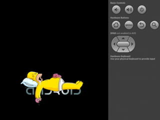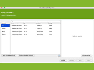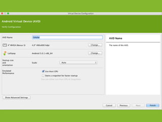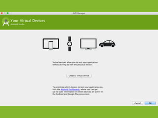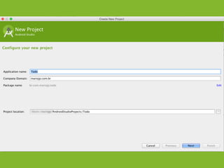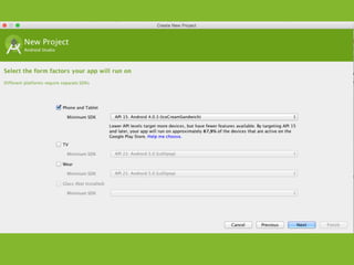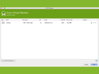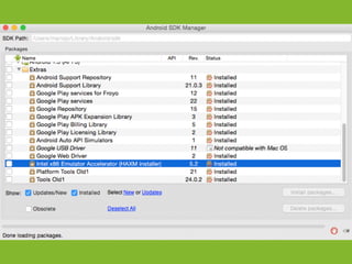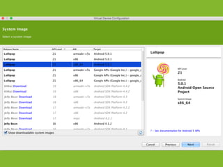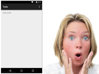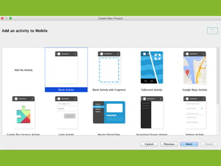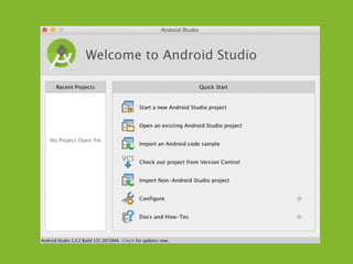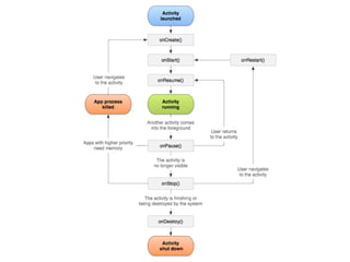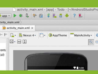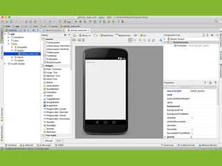 The document provides an overview of how to get started developing Android applications. It discusses creating an Android project structure with Java code, XML layouts and resources. It also covers basic Android app components like activities, intents, views and lifecycle methods. The document then demonstrates how to work with lists, menus, context menus and storing data using SQLite and a database.