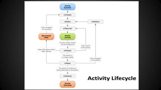 The document outlines a workshop on Android development, covering essential topics such as the Android platform, development environment, application fundamentals, user interface design, and working with web services like JSON. It includes a detailed explanation of app structure, components, and coding examples for creating interactive applications. Additionally, it provides references for further study and thanks participants for their involvement.