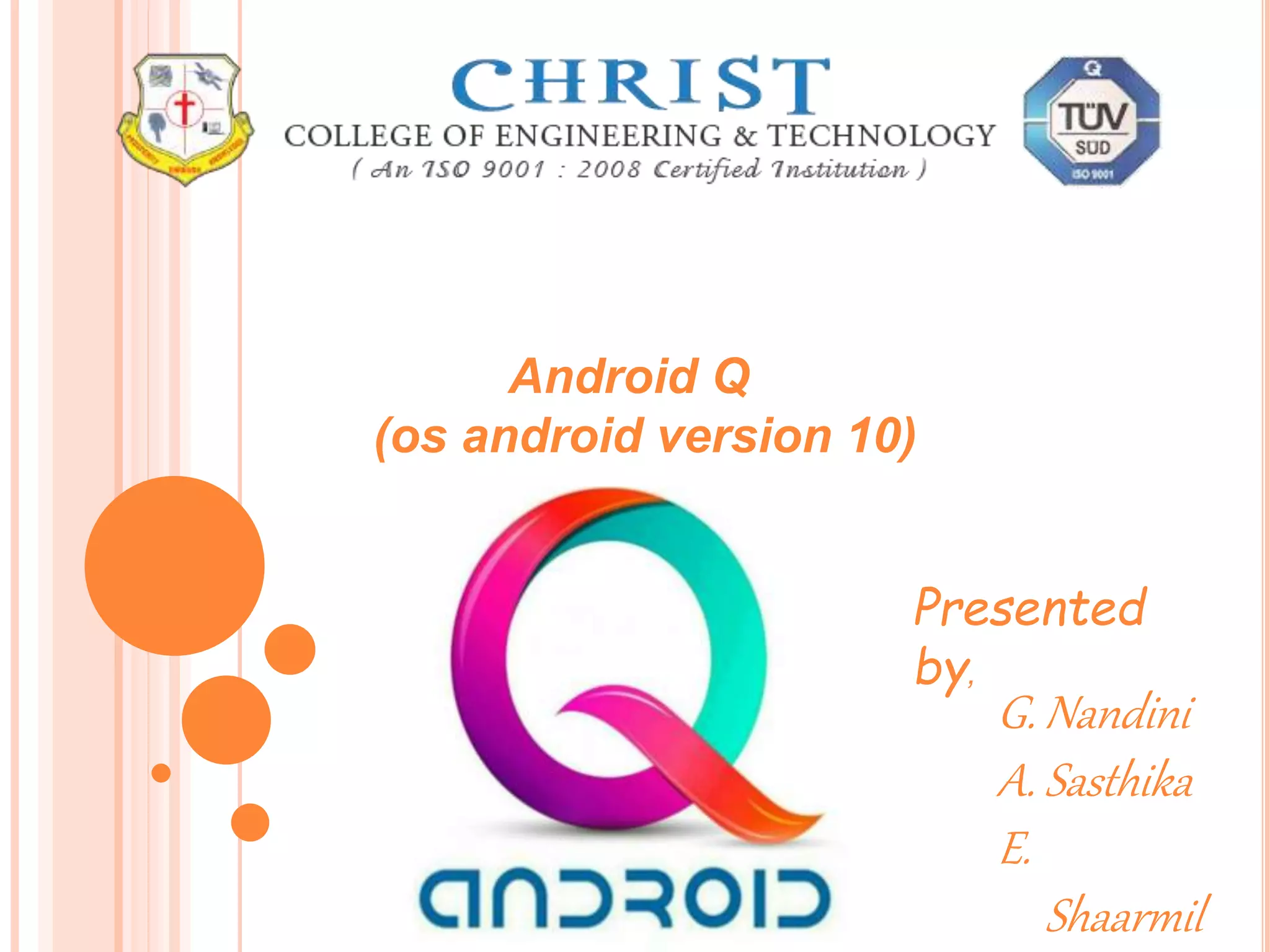 Android Q (version 10 of the Android OS) was presented and includes the following key features: