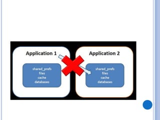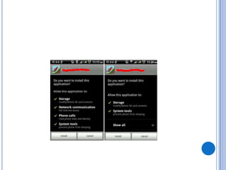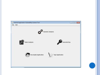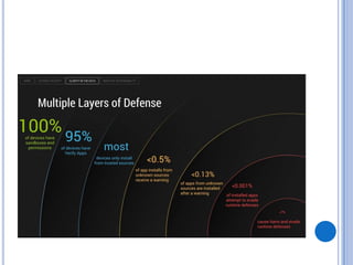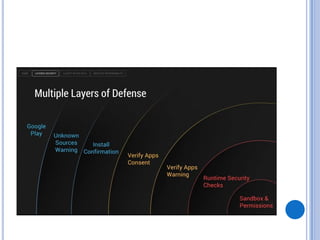 The document discusses Android security and provides an overview of key topics. It begins with Android basics and versions. It then covers the Android security model including application sandboxing and permissions. It defines Android applications and their components. It discusses debates on whether Android is more secure than iOS and outlines multiple layers of Android security. It also addresses Android malware, anti-virus effectiveness, rooting, application vulnerabilities, and security issues.