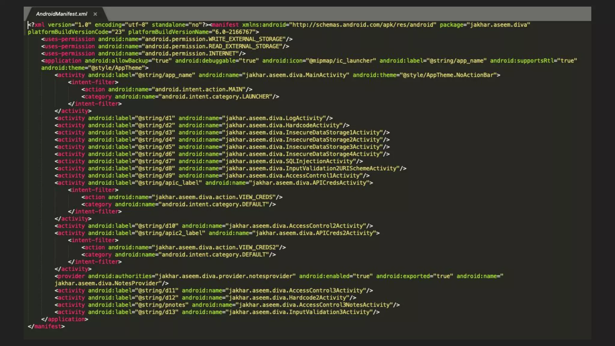 This document provides an overview of Android security and penetration testing. It discusses the Android runtime environment and application fundamentals. It then examines the contents of an Android APK file, including the AndroidManifest.xml and code files. The document outlines the Android sandbox security model and various tools for decompiling and analyzing APKs. It introduces the DIVA vulnerable Android app and demonstrates several common security issues like insecure data storage, input validation problems, and ways to capture network traffic.