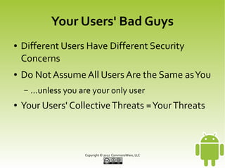 This document discusses securing Android applications by encrypting data. It recommends encrypting data stored locally using SQLCipher, which provides encryption of SQLite databases with AES-256. The document outlines how to integrate SQLCipher by replacing import statements, supplying passphrases, and testing. It also discusses challenges with passphrases and suggests multi-factor authentication by combining user-supplied pieces from different sources like NFC tags or biometrics.