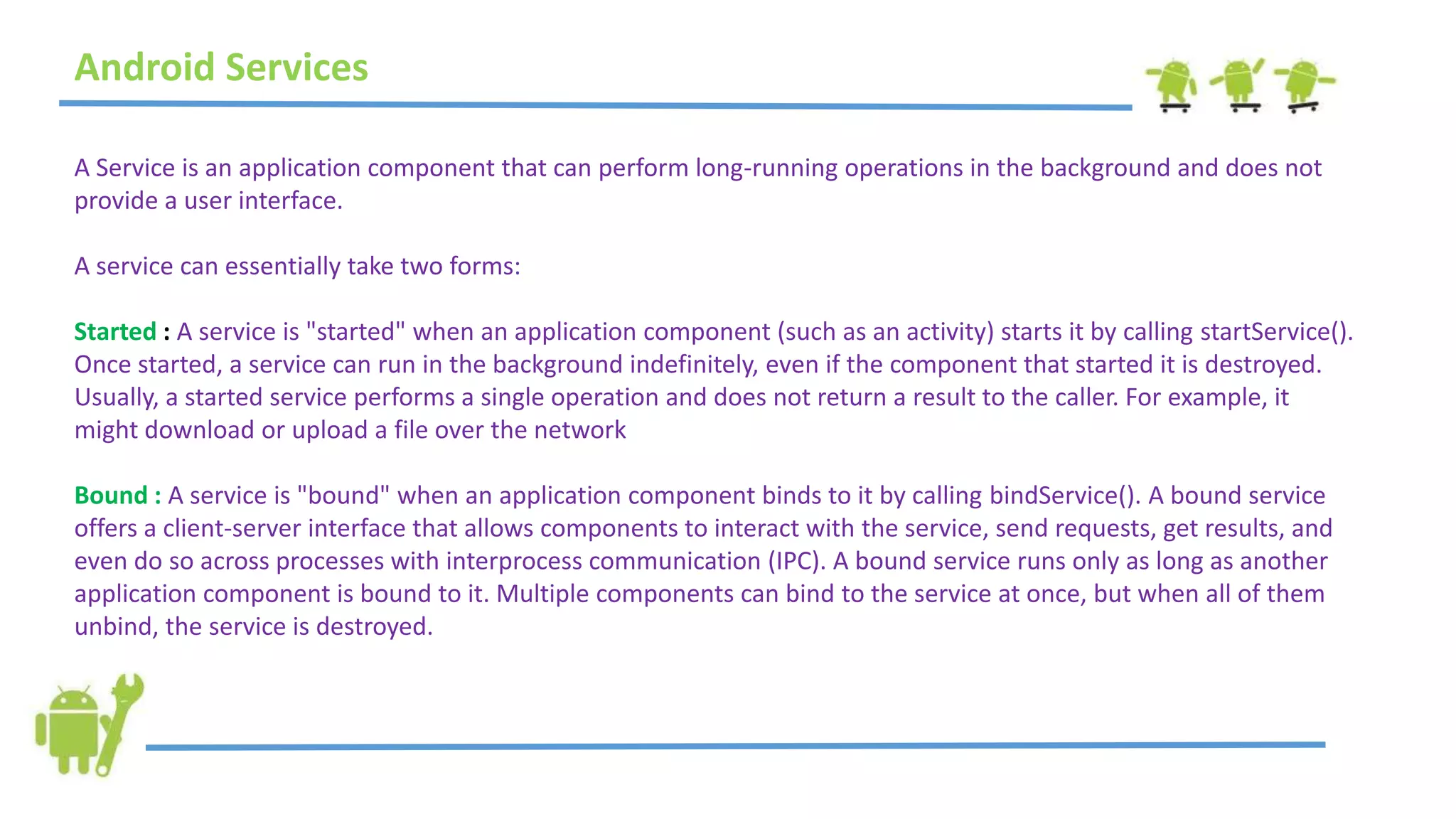 Android services allow long-running tasks to perform work in the background independently of an application's user interface. There are two main types of services: started services which can perform operations indefinitely even if the starting component is destroyed, and bound services which offer a client-server interface between a component and the service. Services must be started with startService() or bound to with bindService() and have lifecycle callback methods like onStartCommand(), onBind(), onCreate(), and onDestroy(). The IntentService class simplifies started service implementation. Bound services can expose interfaces using Binder, Messenger, or AIDL to allow inter-process communication.