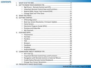 The document provides a user guide for an Android set-top box (STB). It describes what is included in the box, an overview of the STB and remote control, how to set up the STB, navigate the home screen and electronic program guide (EPG), subscribe to and watch channels, use featured apps like FlixUniverse, YouTube, Pandora and more. It also covers how to connect to Wi-Fi, change display settings, and answers frequently asked questions.