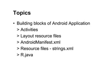 This document provides an overview of the key building blocks of an Android application, including activities, layout files, strings.xml resource files, the AndroidManifest.xml file, and the R.java file. It describes activities as representing screens in an app, layout files defining the user interface, strings.xml for storing text strings, the manifest file providing essential app metadata, and R.java automatically mapping resource IDs.