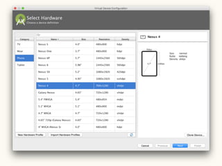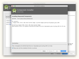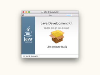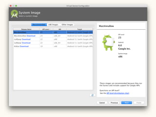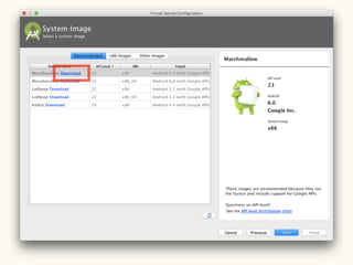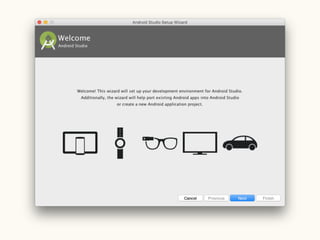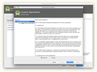 This document provides a setup guide for Android development on Mac OS X 10.11. It outlines installing Android Studio and the Java Development Kit version 8. It then walks through creating a basic "Hello World" project in Android Studio to confirm that the environment is properly configured.