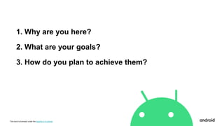 This document outlines an Android study jam session which aims to teach participants the basics of building Android apps using Kotlin. The session covers setting up Android Studio, building simple apps, learning Kotlin fundamentals like variables, functions, classes and activities. It also discusses Android app UI components, the activity lifecycle, and resources for continuing to learn Android and Kotlin development.
