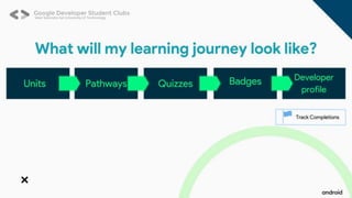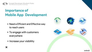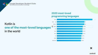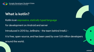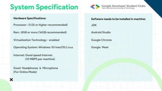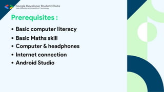 The document outlines ground rules for an online meeting, including muting microphones, using chat for questions, avoiding spam, reporting technical issues, respecting diverse opinions, and asking questions during an AMA session. It then lists learning objectives for an Android app development workshop which are to set up Android Studio, learn Kotlin basics, find resources to continue learning, build teams, work on an app, and submit it to a Github repository. More details on app submission will be provided later.