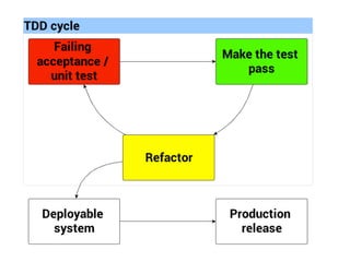 The document discusses Test-Driven Development (TDD) practices for Android, detailing the process for implementing functionality through automated tests, including examples of passing and failing tests. It highlights the architecture of Android testing frameworks such as ActivityInstrumentationTestCase2, and features code snippets for testing features like timeline display. Additionally, it covers optimizations for async loading and provides examples of integration and unit tests, concluding with references and resources for further exploration.