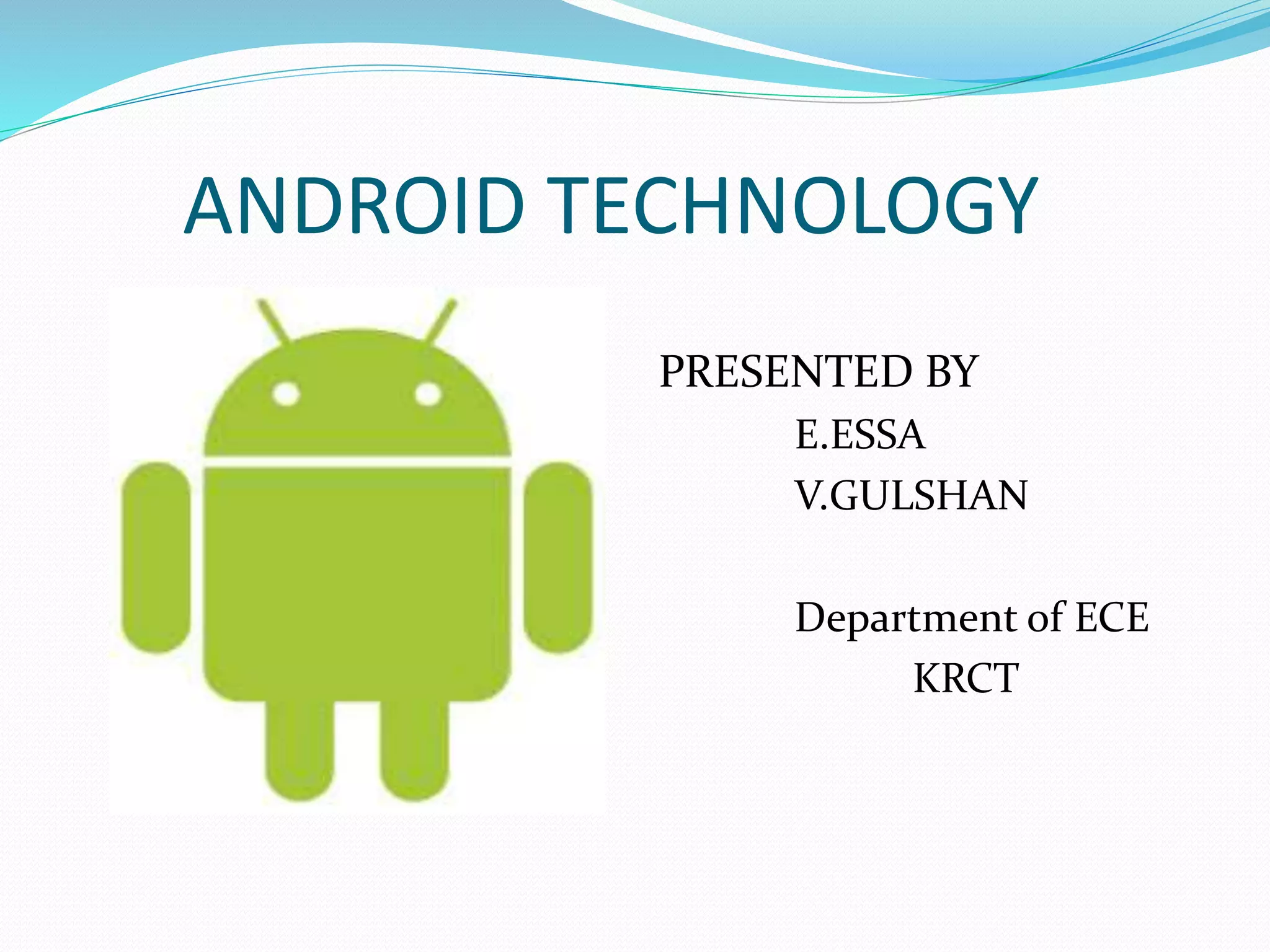 Android was created by Andy Rubin, Rich Miner, Nick Sears and Chris White at Android Inc. in 2003 and was later acquired by Google. It is an open-source, Linux-based operating system used primarily in smartphones and tablets. Major versions include Cupcake, Donut, Eclair, Froyo, Gingerbread, Honeycomb, Ice Cream Sandwich, Jelly Bean, KitKat, Lollipop, Marshmallow, and Nougat. The platform emphasizes customization and integration of Google services.