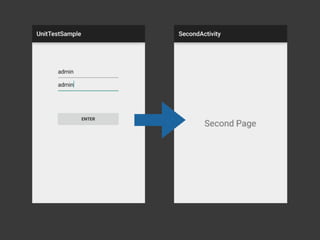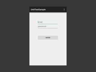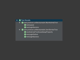 The document discusses Android testing tools and provides code examples for implementing user authentication using those tools. It recommends Mockito for mocking, Espresso for UI testing, and Dagger for dependency injection. It then shows how to create a UserService class using Dagger dependency injection to handle user authentication via shared preferences. The code is refactored over multiple sections to introduce these tools and improvements like validating the password and keeping the user signed in.