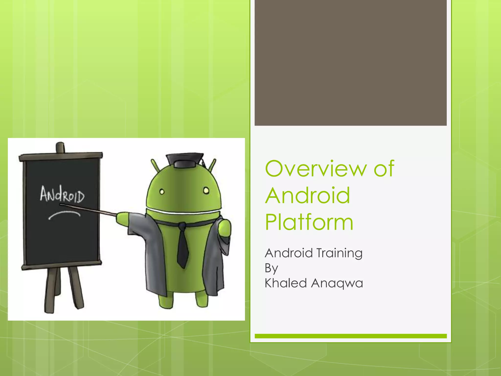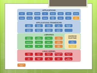 Android is an open source, Linux-based operating system designed for smartphones and tablets. It uses Linux for core system functions and includes the Dalvik virtual machine, application framework, and key applications. Android applications are developed using Java and compiled to run on the Dalvik VM. The Android SDK provides tools and libraries for building apps that can access the device's features like sensors, location services, and more through activities, services, content providers, and broadcast receivers that communicate via intents.