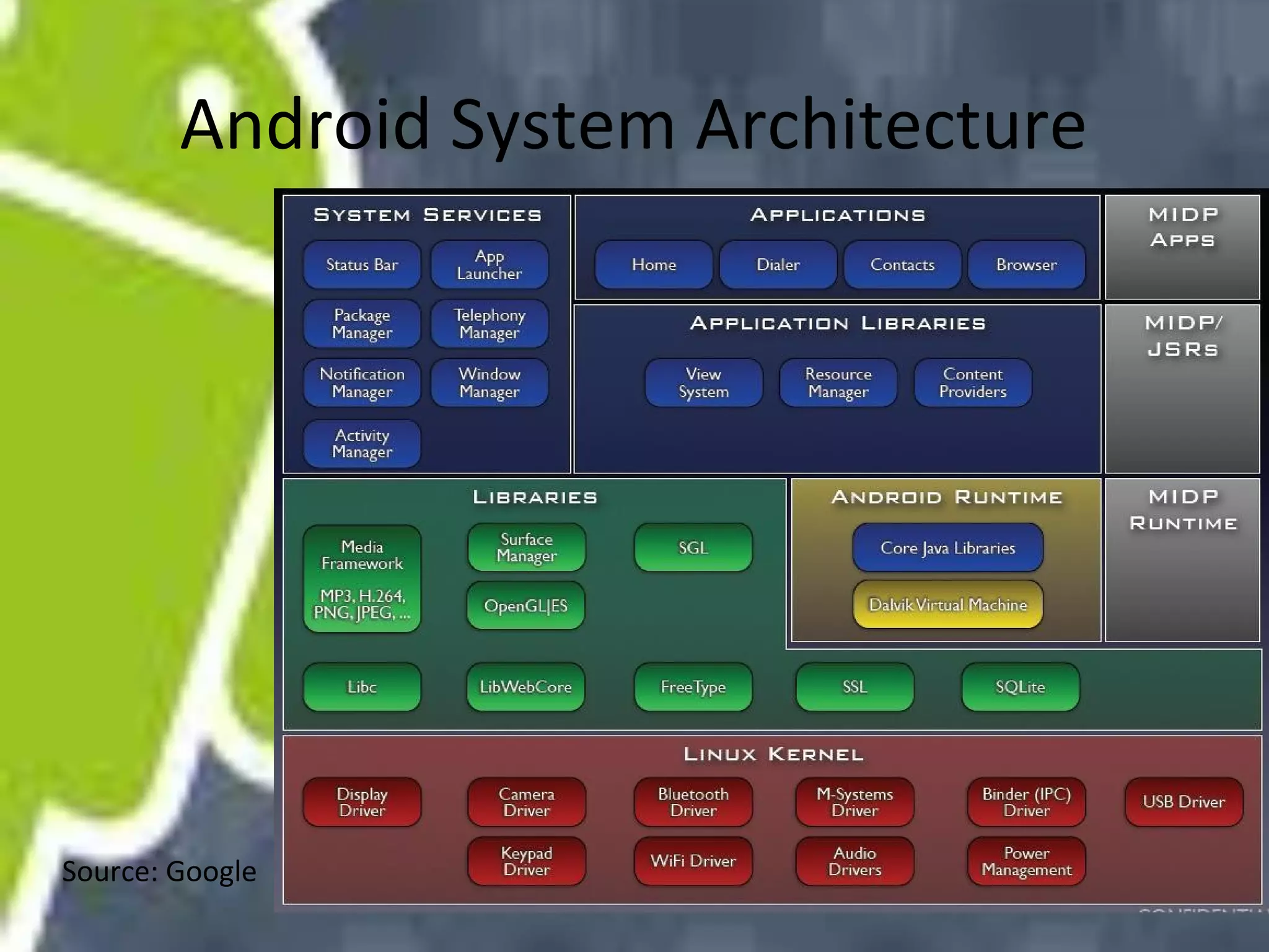 Android uses a Linux kernel for core system services. It includes native libraries for graphics, media playback, and databases. The Android runtime includes the Dalvik VM and Java core libraries. The application framework manages activities, content providers, notifications and resources. Activities display user interfaces. The media framework uses OpenCore for formats like MP3 and MPEG-4. It has a client-server architecture with MediaPlayer as the client. Activities have a lifecycle managed by the activity manager using intents. Content providers manage shared data through a client-server model using URIs. Permissions control access between apps and the system.