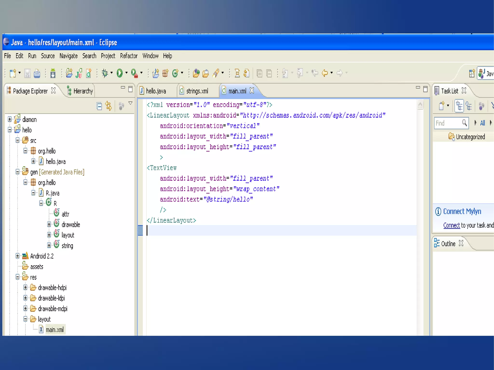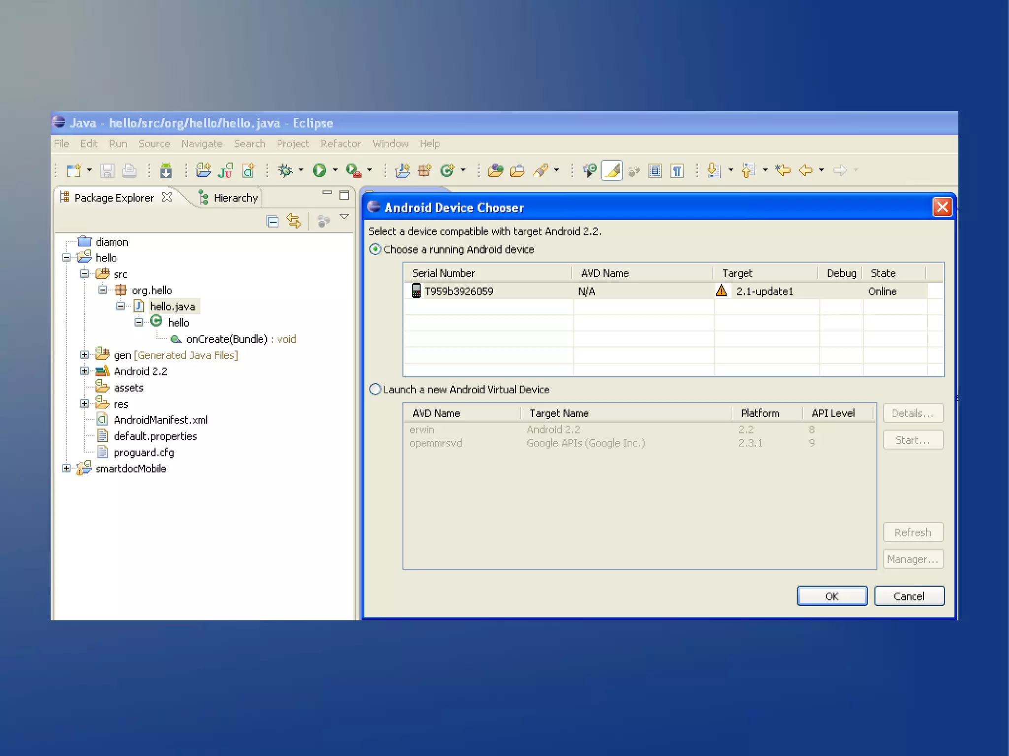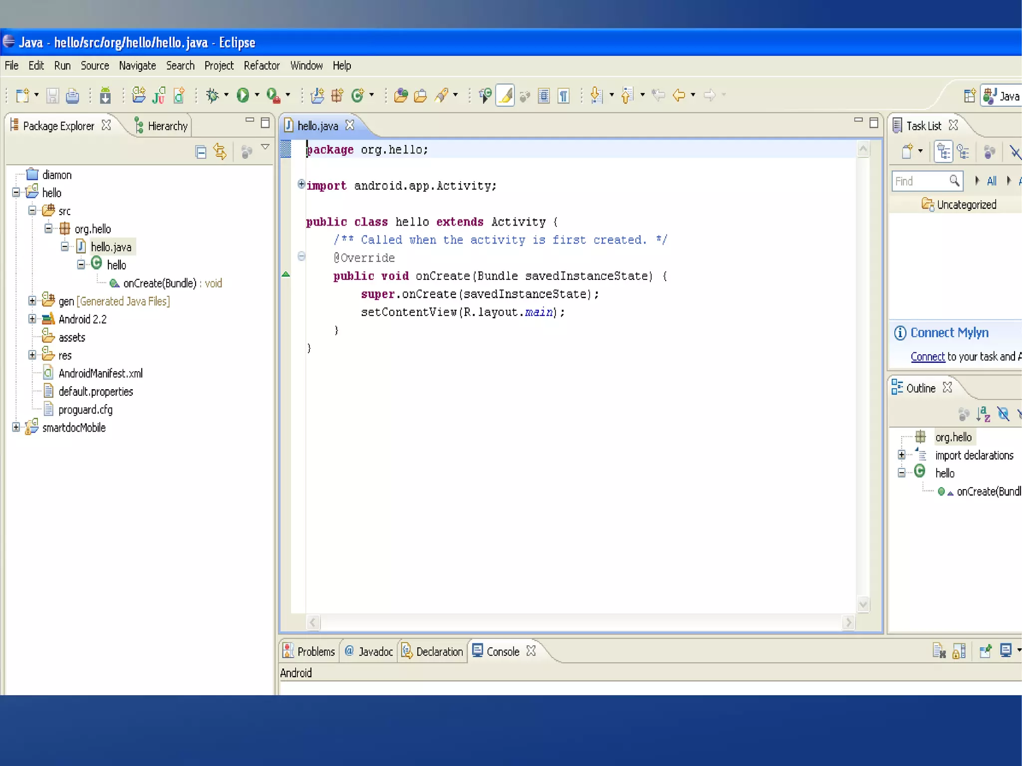 This document provides an overview of setting up the Android development environment and creating basic Android projects. It discusses downloading the necessary software including the Java Development Kit, Eclipse IDE, and Android SDK. It also explains how to install the Android Developer Tools plugin for Eclipse. The document demonstrates how to create a simple "Hello World" project and tabbed application. It discusses accessing sensors on Android devices like GPS and accelerometers. Finally, it covers using local SQLite and remote databases to store and access data.