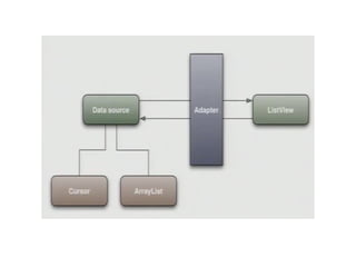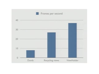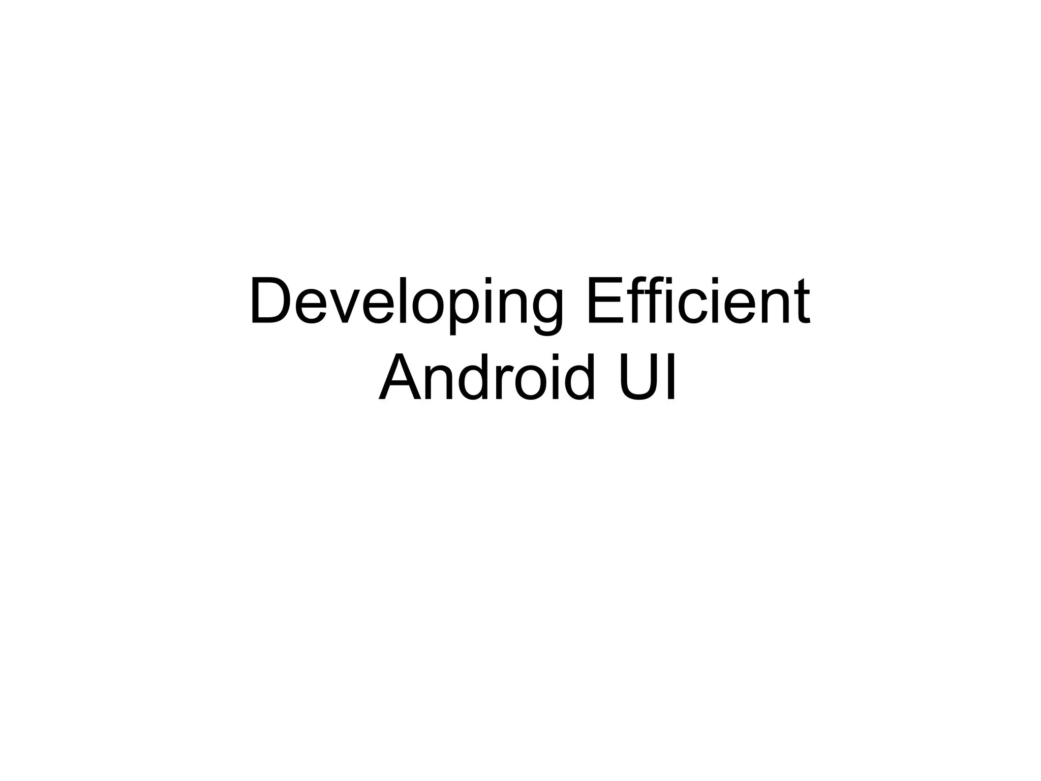 The document discusses various techniques for developing efficient Android user interfaces (UIs), including using adapters, view holders, pre-scaling bitmaps, custom views, custom layouts, and more. Adapters act as a bridge between data and views. View holders minimize finding views repeatedly. Pre-scaling bitmaps improves performance over scaling at runtime. Custom views and layouts allow defining user-defined UI elements instead of using pre-defined ones only.