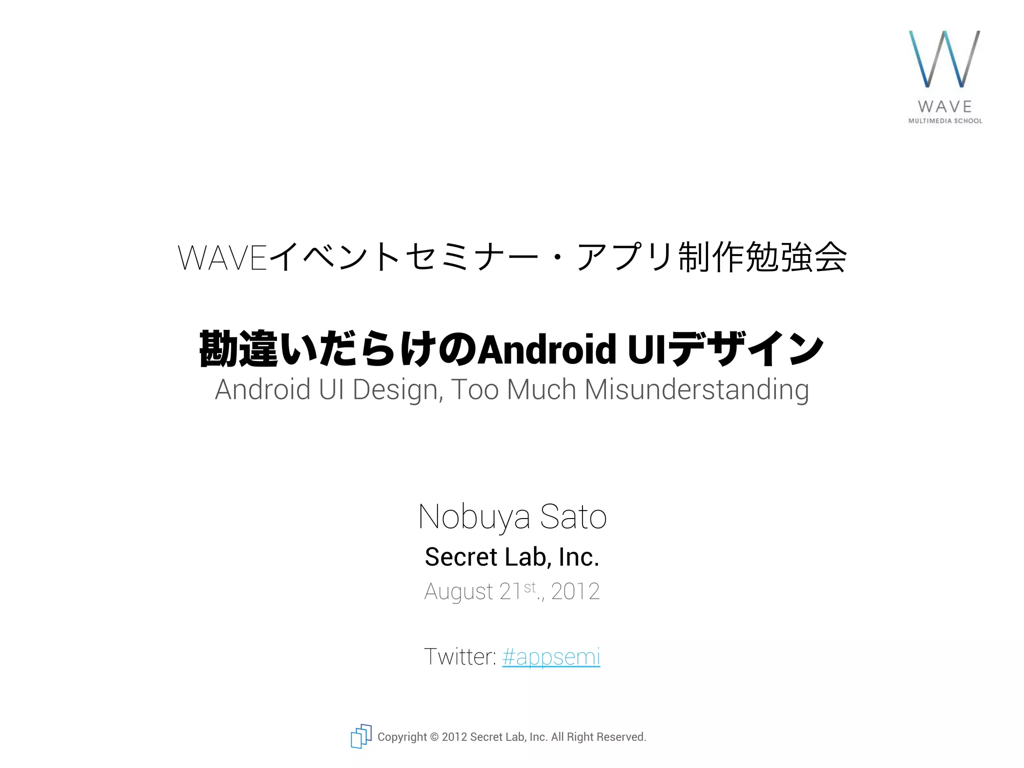 【増員!→370名】 開発者、デザイナー必見! アプリ制作勉強会 / 勘違いだらけのAndroid UIデザイン 発表資料(2012年8月21日) http://atnd.org/events/31039 The presentation doc for Smartphone application design seminar on 2012/08/21 by WAVE Multimedia School.