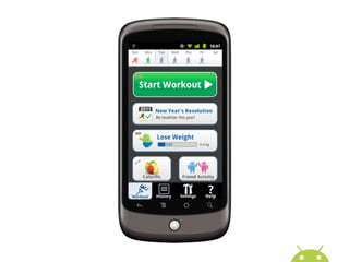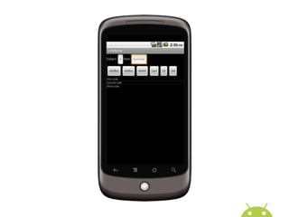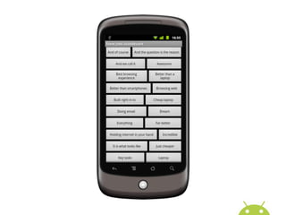 This document provides Android UI design tips and best practices. It discusses principles like focusing on the user, visibility, feedback, predictability and fault tolerance. It also covers common patterns like dashboards, action bars, quick actions, search bars and lists. The document recommends following Android guidelines and testing designs with real users. It notes that while the Android market has low-quality apps, good designs can deliver value and drive growth.