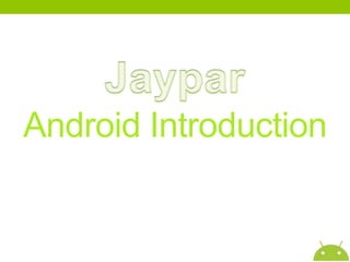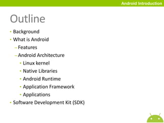 The document provides an introduction to Android, detailing its features, architecture, and development environment. Android is described as a software stack for mobile devices based on the Linux kernel, optimized for various applications and hardware configurations. It also mentions the Open Handset Alliance's role in promoting the Android platform, which includes tools and resources for developers to create mobile applications.