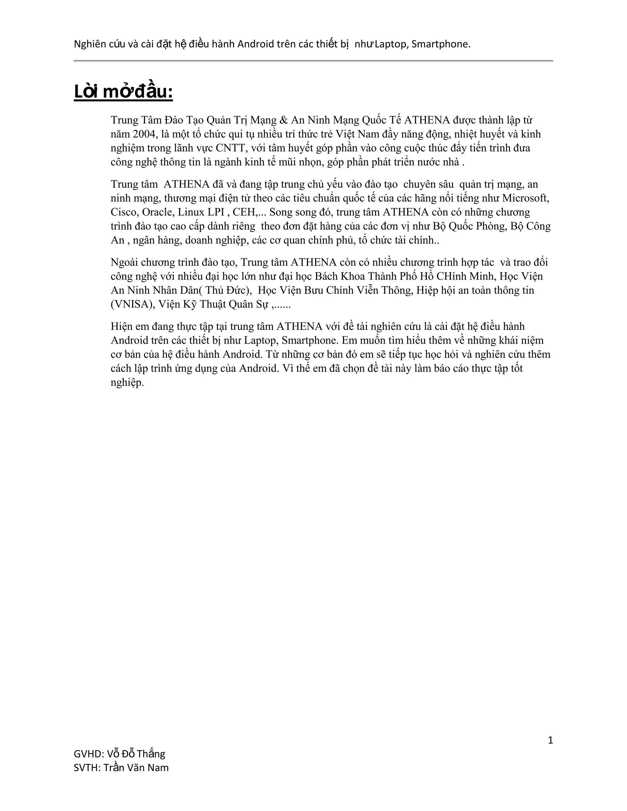 Tài liệu nghiên cứu về cài đặt hệ điều hành Android trên các thiết bị như laptop và smartphone, bao gồm lịch sử phát triển, đặc điểm, và quy trình cài đặt. Đặc biệt, nó nhấn mạnh tính mở và khả năng phát triển ứng dụng của Android, đồng thời đề cập các lỗ hổng bảo mật và phương pháp xâm nhập. Trung tâm đào tạo Athena đã cung cấp môi trường thực tập cho sinh viên để tìm hiểu và thực hiện nghiên cứu này.