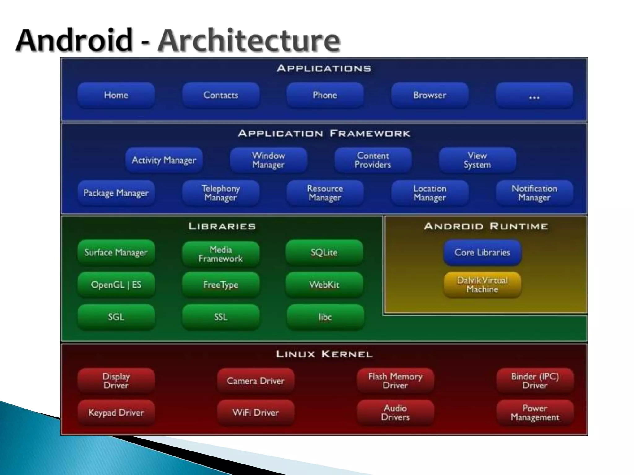 - The Android SDK provides tools for application development using Java and resources for graphics, layouts etc.
