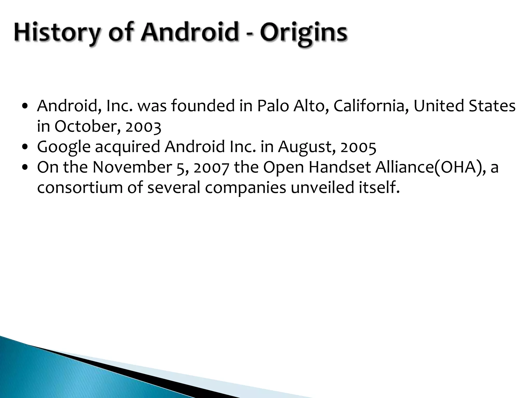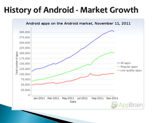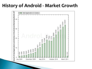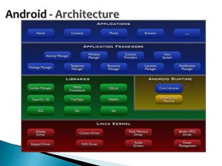 Android is an open source software stack for mobile devices. It was founded in 2003 by Android Inc which was later acquired by Google in 2005. It includes an operating system, middleware and key applications. Some key points about Android include: