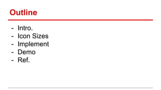 The document provides a tutorial on using SVG (Scalable Vector Graphics) in Android applications, detailing its definition, graphics quality, and animation attributes. It outlines the necessary icon sizes for different Android screen densities and types, explaining contextual, notification, action bar, and launcher icons. Additionally, the document describes the Victor Android plugin for implementing SVG, including installation steps, known issues, and examples of usage.