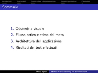 Il documento descrive il progetto di sviluppo di un modulo di visual odometry per dispositivi mobili, focalizzandosi sulla navigazione indoor. La tesi analizza approcci esistenti e limitaioni, proponendo un metodo che utilizza l'analisi video delle immagini per determinare il percorso. Vengono presentati i dettagli dell'implementazione pratica su piattaforma Android utilizzando la libreria OpenCV.