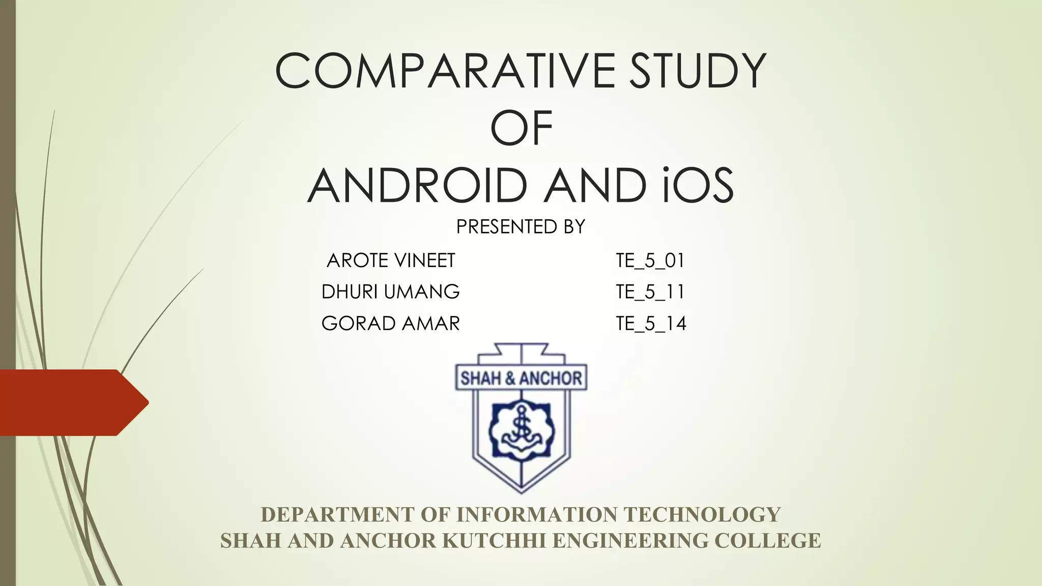 This document compares and contrasts the Android and iOS operating systems for smartphones. It provides an introduction to smartphones and the logos of Android and iOS. It then details the history and evolution of both Android and iOS. The main features, file management, process management, and memory management of each operating system are described.