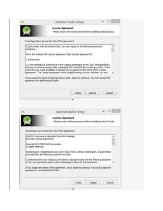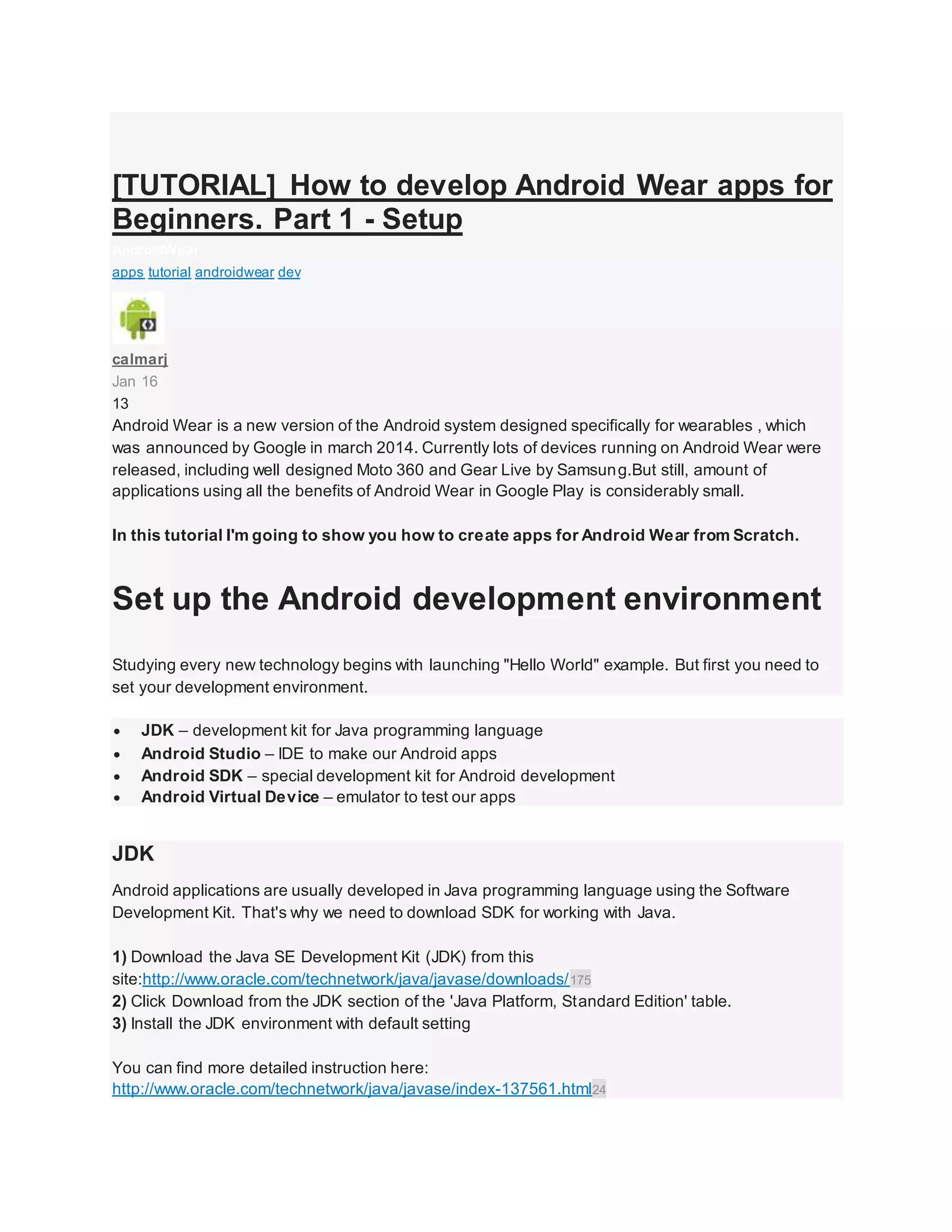 This document is a tutorial on how to set up an Android development environment to build Android Wear apps. It discusses downloading and installing the Java Development Kit (JDK), Android Studio IDE, Android SDK, and creating an Android Virtual Device (AVD) emulator. It then demonstrates creating a new Android Wear project from a sample app provided by Google and running the app on the AVD emulator. The tutorial is intended for beginners and covers the basic setup and running of a simple Android Wear app.
