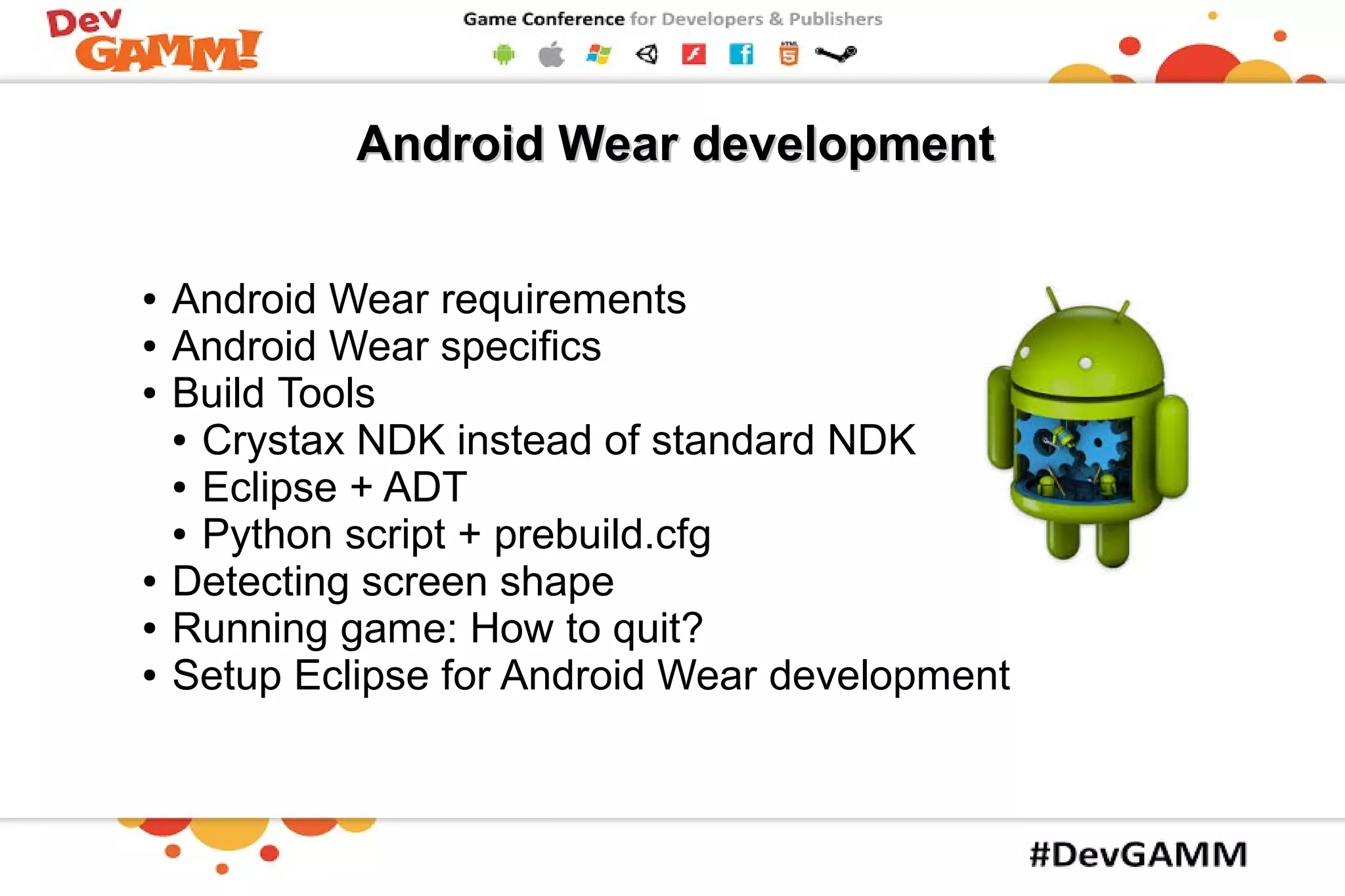 This document discusses various nuances for Android Wear game development including updating SDK tools to version 23.0 or higher, using the Crystax NDK instead of the standard NDK, setting up Eclipse for Android Wear development, detecting screen shape on different watches, and how to configure a game to quit properly on Android Wear. It provides links to tutorials on packaging a game manually for Android Wear, using a Python script and prebuild configuration file, and setting up an Android Wear development environment in Eclipse.