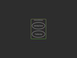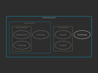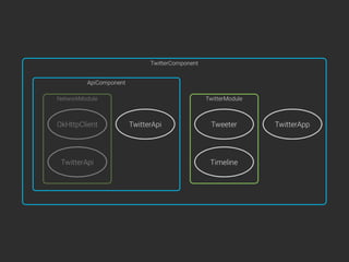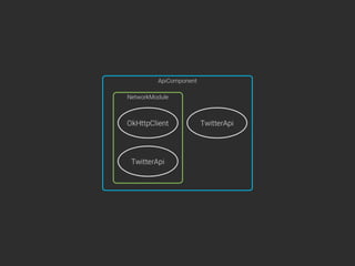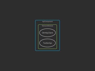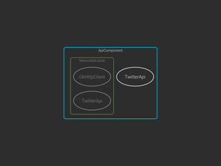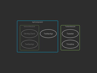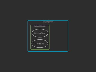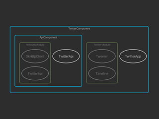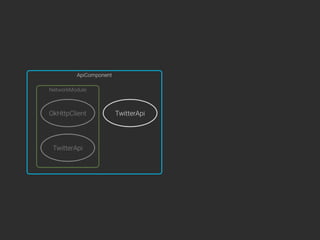 The document discusses dependency injection and Dagger 2. It explains that dependency injection is a design pattern where dependencies are provided to classes rather than having classes create their own dependencies. Dagger 2 uses modules annotated with @Module to provide dependencies, with methods annotated with @Provides. Classes request dependencies using @Inject. A component provides a bridge between modules and injection points so they can work together. The document provides examples of using Dagger 2 to define modules that provide dependencies and inject them into classes.