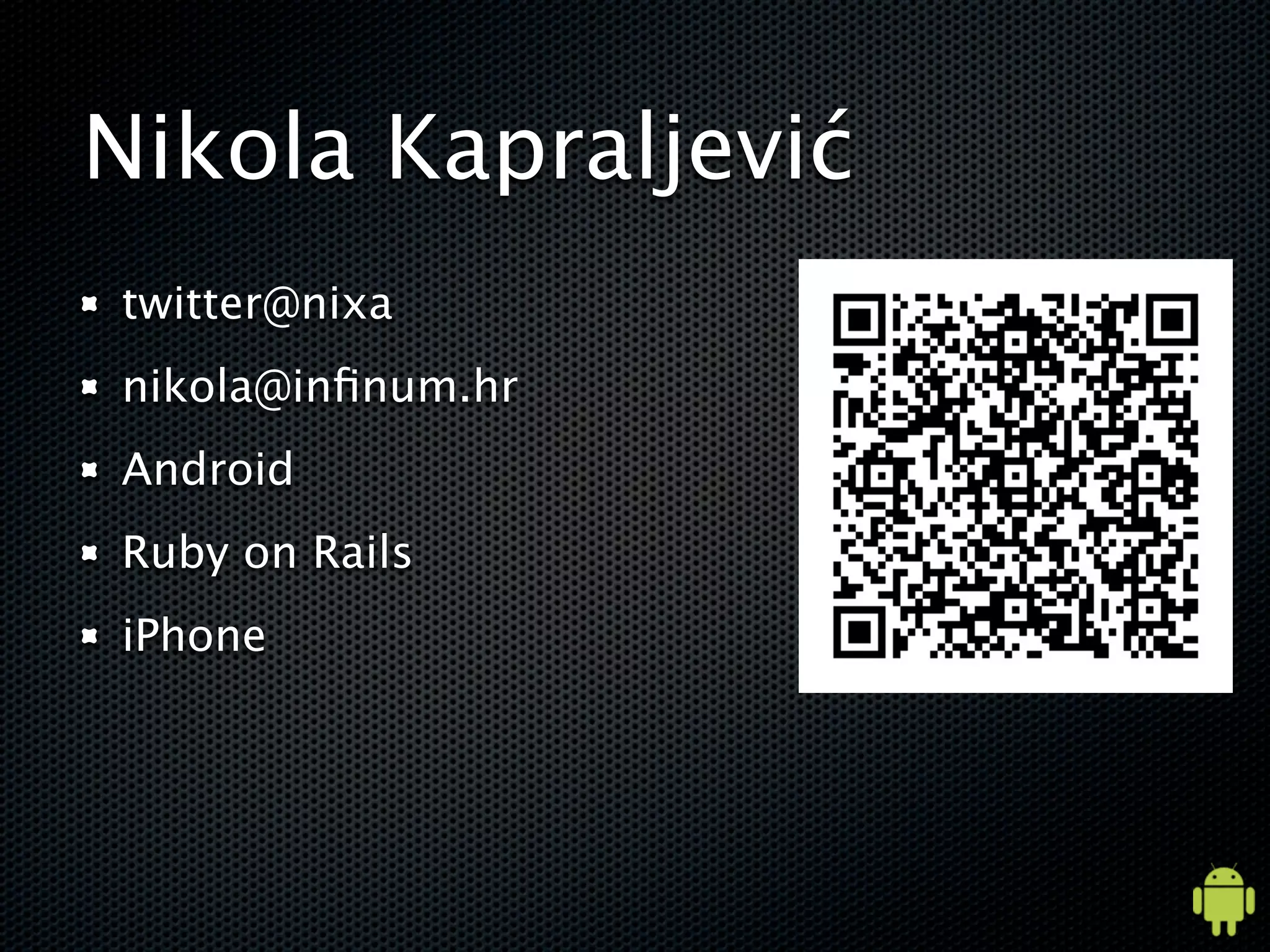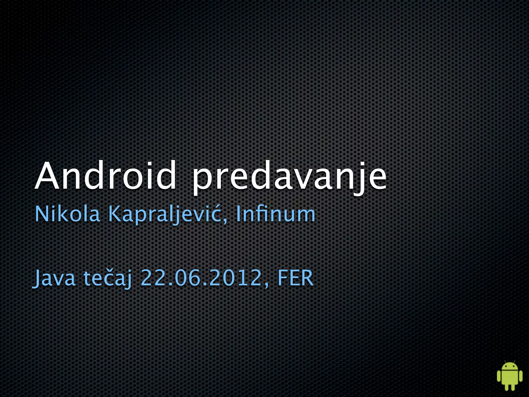 This document is a lecture by Nikola Kapraljević on Android development, covering topics such as the Android operating system architecture, application framework, and common development practices. It includes examples of building user interfaces, managing application components, and utilizing intents for communication between activities. Additionally, it touches on application distribution and market considerations for developers.