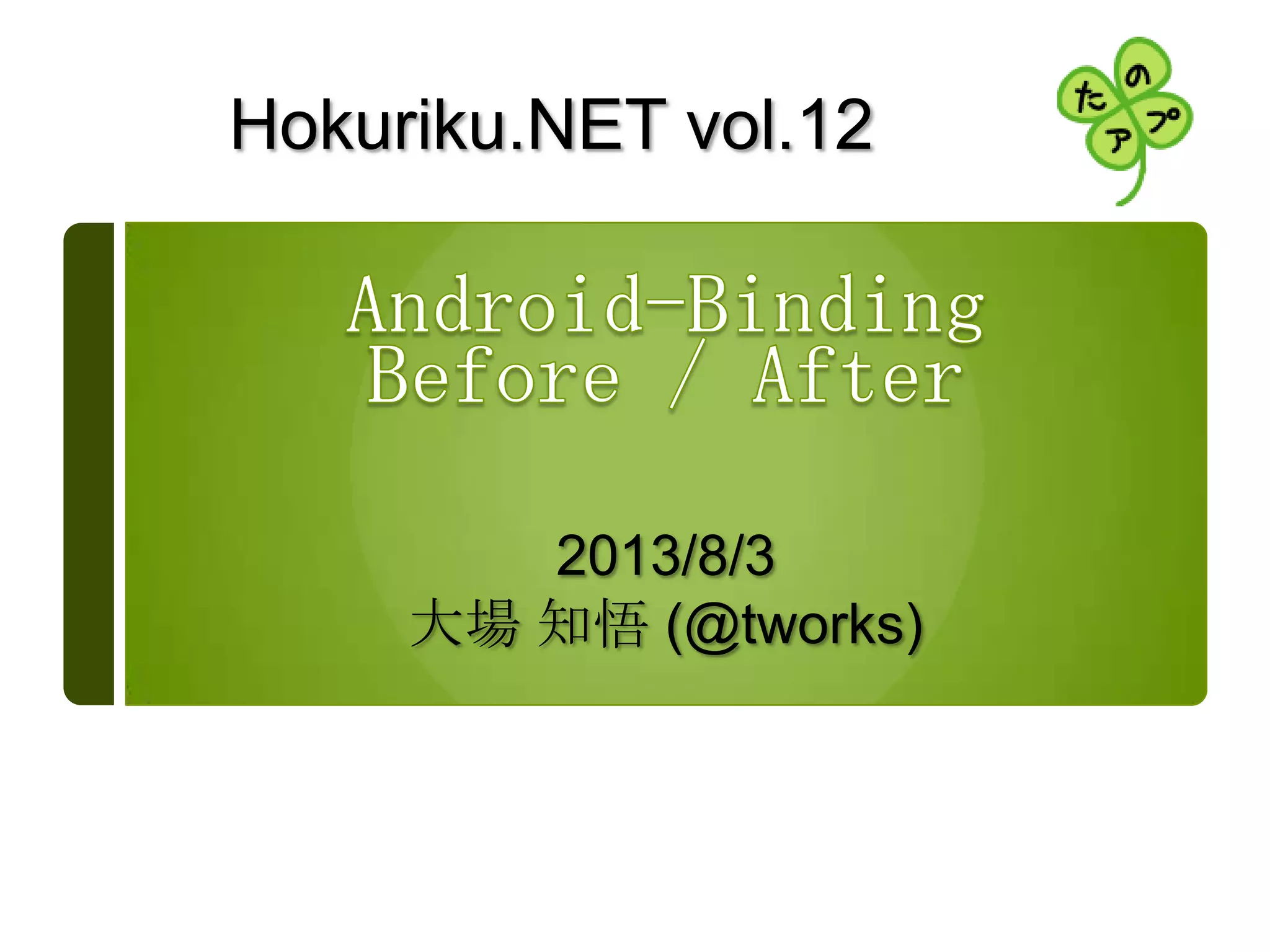 Android-Binding Before/After (Hokuriku,NET) 1. 2. 3. 4. 5. 6. 7. 8. 9. 10. 11. 12. 13. 14. 15. 16. 17. 18. 19. 20. 21. 22. バインド 【 bind 】