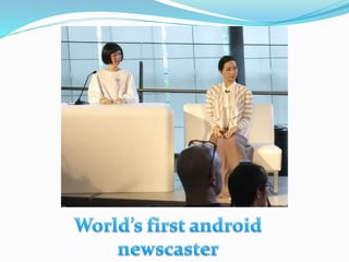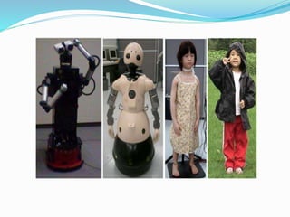 The document discusses the development of androids and their humanlike capabilities, including mechanisms for movement and facial expressions. It explores cognitive studies related to the 'uncanny valley' phenomenon and the potential for androids to engage in human-like communication. The conclusion emphasizes the importance of android science for understanding future interactions between humans and robots in society.