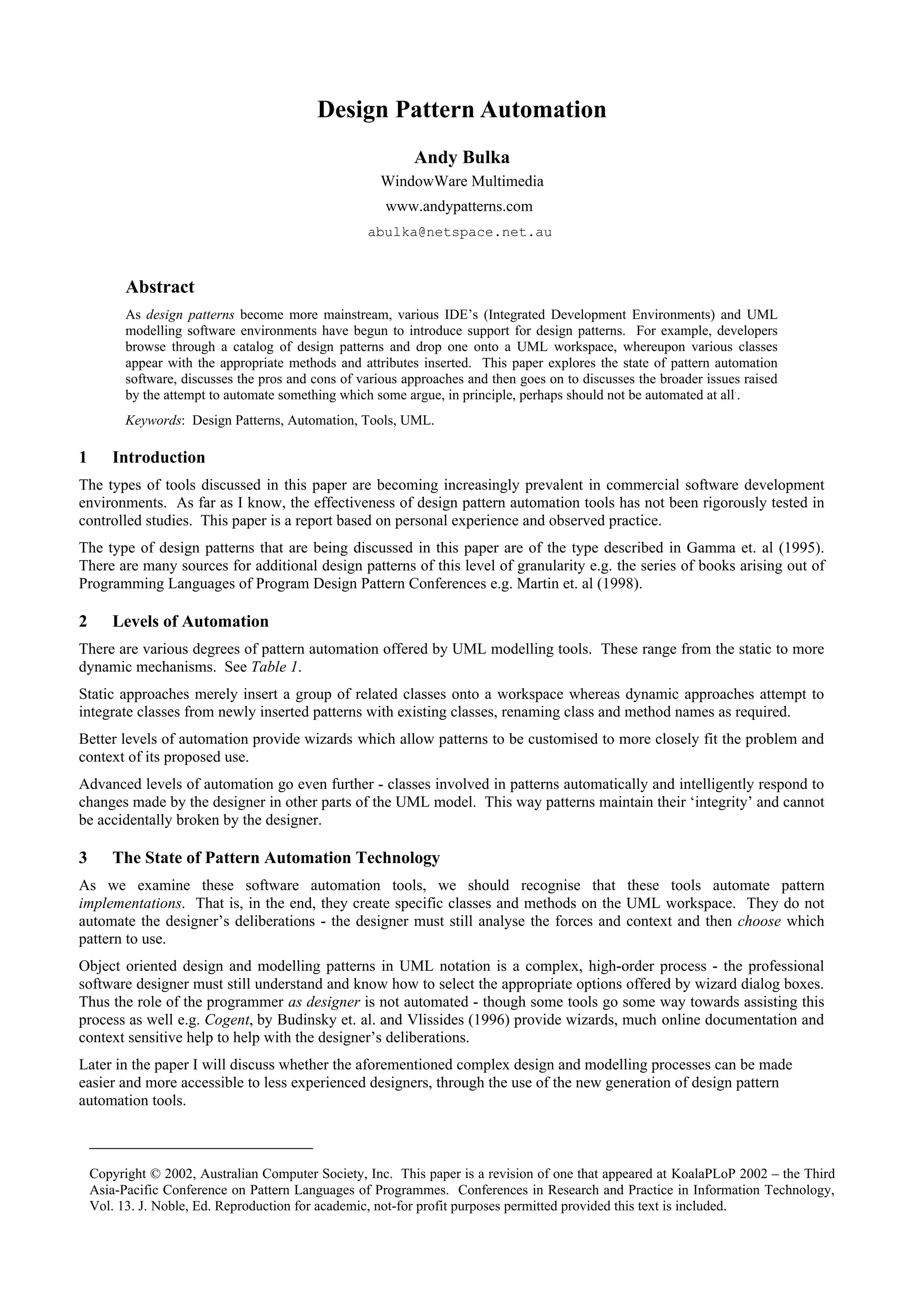 This document discusses the state of design pattern automation tools. It begins by introducing different levels of automation, from simple templates that insert pre-built pattern structures to more advanced dynamic patterns where classes update automatically in response to model changes. The author notes debates around automating design patterns, which involve complex human reasoning, but argues tools aim to assist with implementation not replace designer deliberation. Overall, while one-size-fits-all solutions have limits, parameterised templates with wizards show promise in helping generate custom solutions for designers.