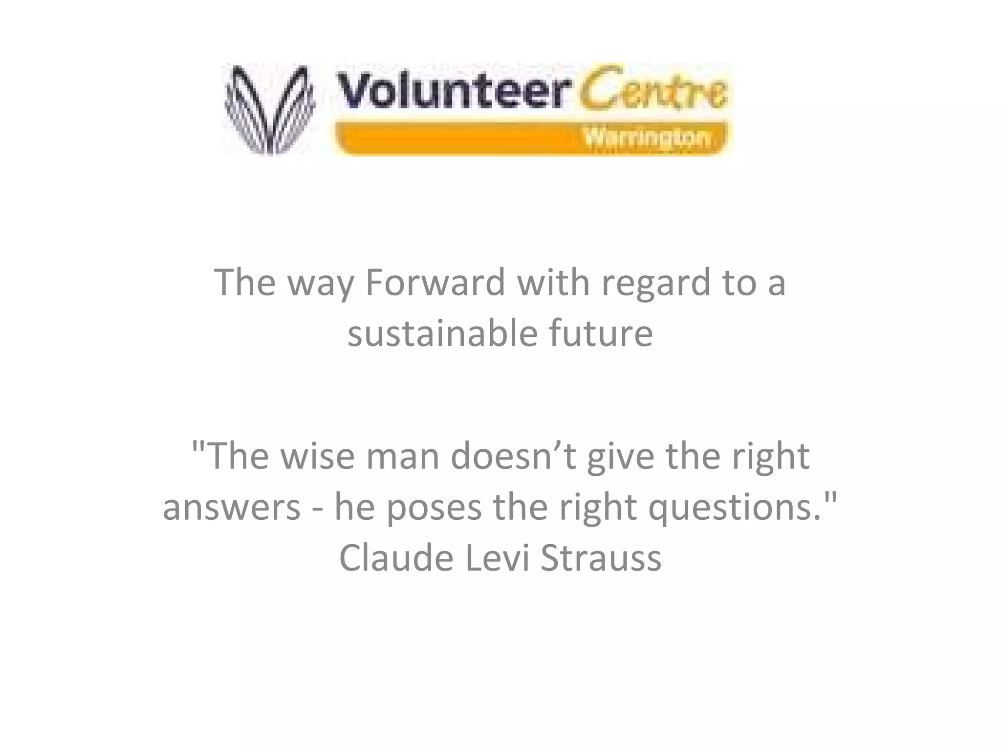 The document discusses sustainability and the way forward for an organization that promotes, supports, and develops volunteering. It outlines the organization's strengths, weaknesses, opportunities, and threats. It proposes ways to promote volunteering through increased awareness, support volunteers through training and resources, and develop new training opportunities and income generation strategies to help ensure the long-term sustainability of the organization.
