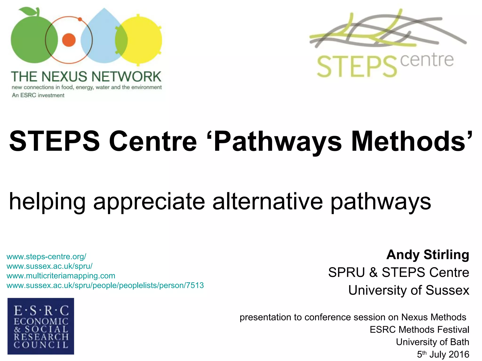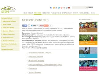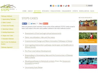 The document outlines the STEPS Centre 'Pathways Methods' for helping appreciate alternative pathways. It summarizes the methods as follows:
