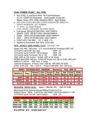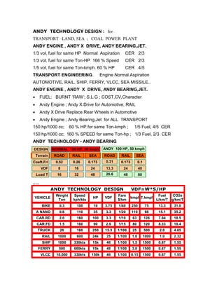 The document discusses transport engineering innovations focusing on the Andy engine and its components for various transport modes including automotive, rail, and maritime. It highlights fuel efficiency improvements, cost savings, and CO2 reductions associated with a coal power plant and alternative fuel approaches. Additionally, it presents financial details, including project ROI and operational metrics for different vehicle types under various conditions.