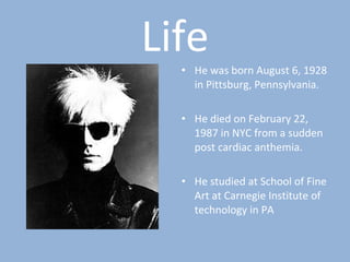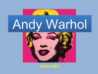 Andy Warhol (1928-1987) was an American artist known for his pop art works that used bright colors and repeated images of popular icons and figures from mass media. Some of his most famous works include Eight Elvises, which depicted Elvis Presley in different poses, and his silkscreen paintings of Marilyn Monroe. Warhol used techniques like silkscreening, which involves a woven mesh and ink-blocking stencil, to reproduce images and explore repetition. He was fascinated by pop culture and mass media and often featured icons like Monroe, Mickey Mouse, and dollar signs in his art.