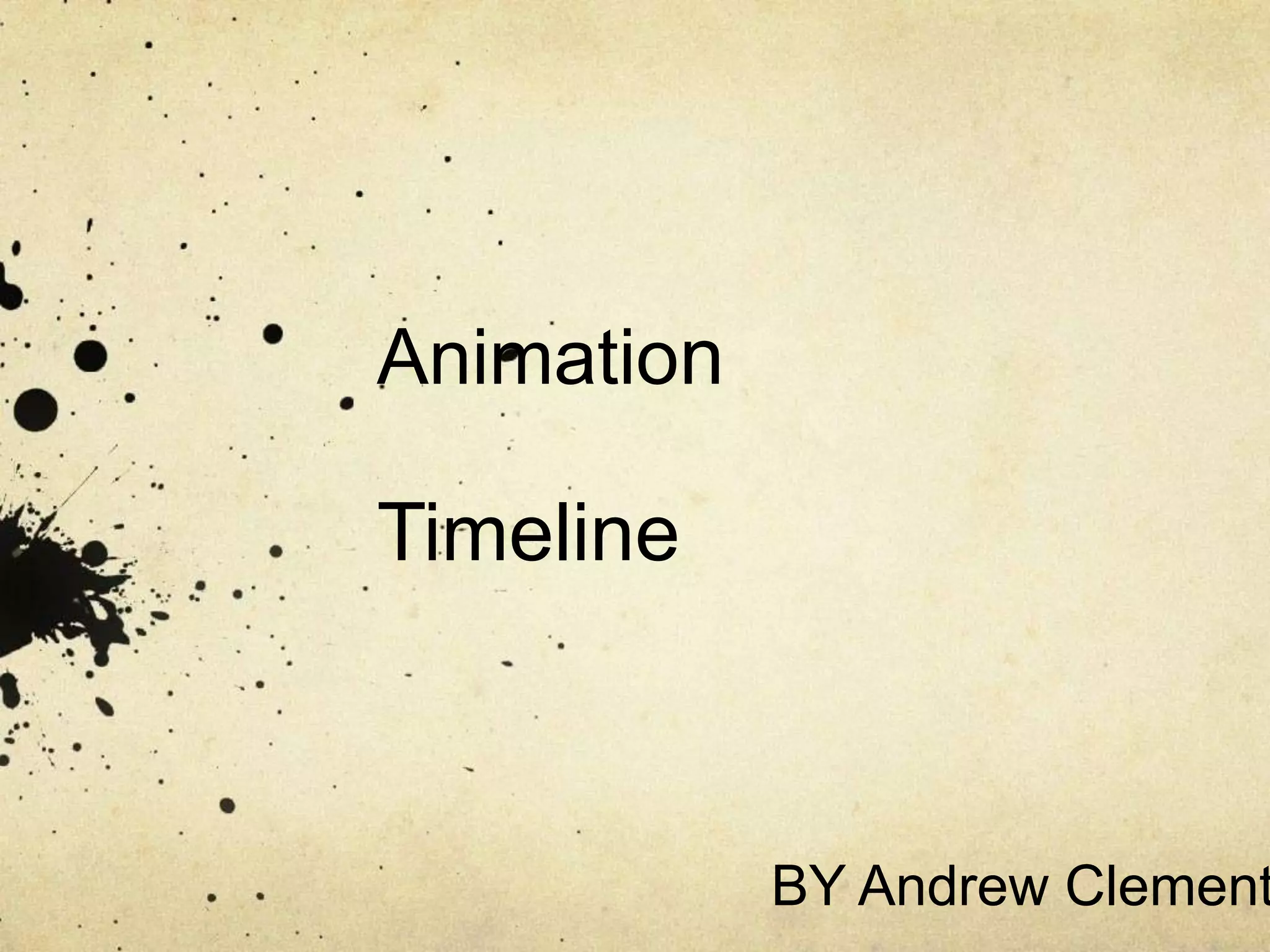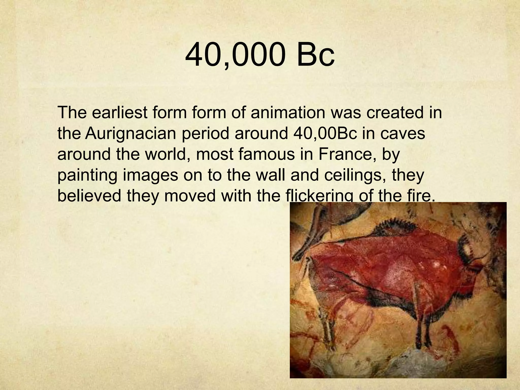 Animation has a long history dating back 40,000 years with cave paintings depicting movement. Shadow puppetry and Greek vases further advanced animation techniques. The magic lantern and early photography experiments led to the creation of basic animated devices like the zoetrope and mutoscope in the 1830s-1860s. Stop motion photography pioneers like Muybridge and Reynaud developed animation technologies. The 1920s saw the addition of sound to animated films. Walt Disney's Steamboat Willie in 1928 was a breakthrough as the first animated film with synchronized sound. Advances in color, computer graphics, and CGI expanded animation possibilities through today.