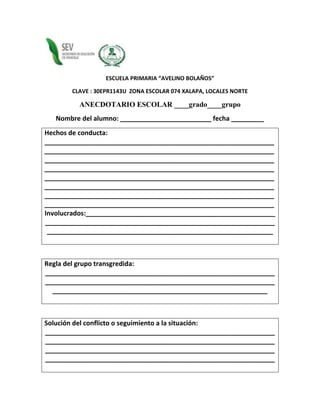 This document appears to be a record from the "AVELINO BOLAÑOS" primary school with details about a student's conduct. It includes the student's name, date, description of the conduct issue, other students involved, school rules that were broken, and notes on how the conflict was addressed. The purpose is to document behavior incidents and their resolution for a class and individual student.