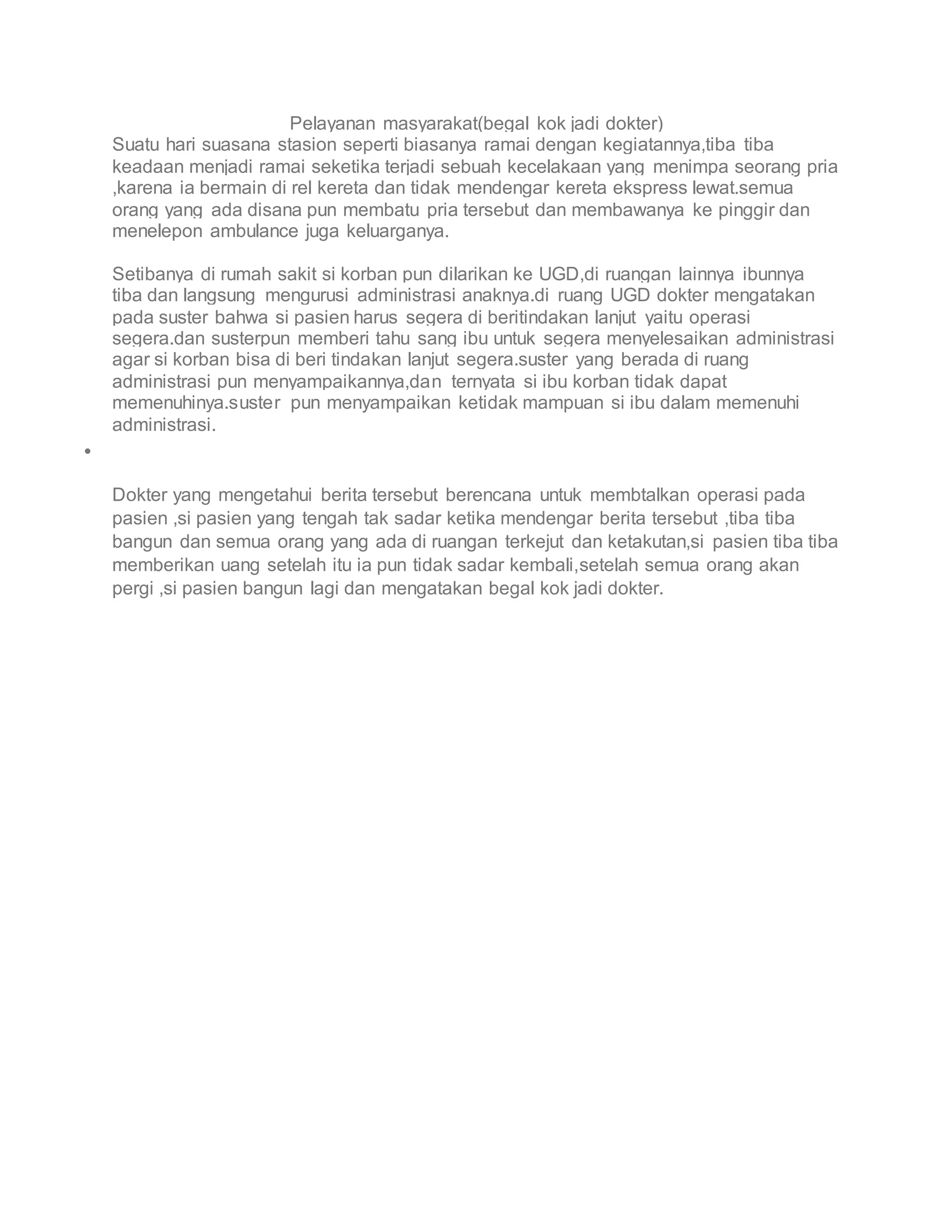 Sebuah kecelakaan terjadi di stasiun ketika seorang pria terluka karena bermain di rel kereta. Meskipun ibunya tidak bisa memenuhi administrasi rumah sakit untuk operasi, pasien tiba-tiba bangun dan memberikan uang, sebelum jatuh kembali tidak sadarkan diri, dan mengeluarkan komentar 'begal kok jadi dokter'. Kejadian ini mencerminkan tantangan dalam pelayanan kesehatan dan pengorbanan orang tua dalam situasi darurat.