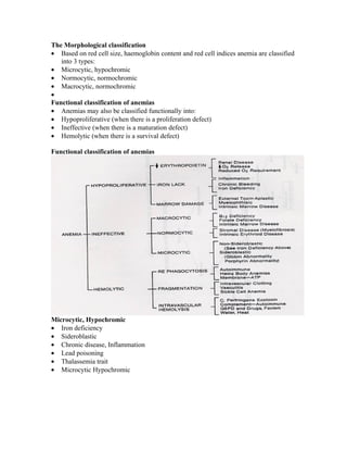 This document provides an overview of anemia, including its definition, classifications, causes, and methods of diagnosis. Anemia is classified based on pathophysiology (increased blood loss, impaired red blood cell production, increased destruction), morphology (microcytic/hypochromic, normocytic/normochromic, macrocytic/normochromic), and function (hypoproliferative, ineffective, hemolytic). Common causes of different types of anemia are outlined. Laboratory tests including red blood cell indices help diagnose the type of anemia and indicate the underlying cause.