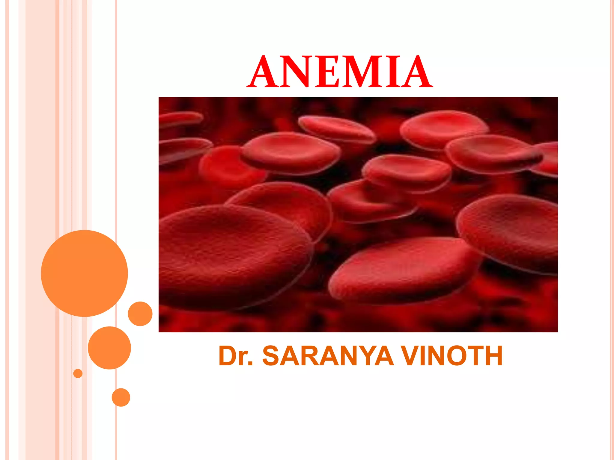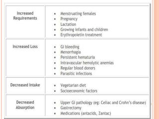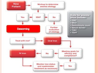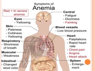 This document provides information about anemia. It begins with an introduction stating that anemia is a major problem in India, affecting many women and contributing to maternal deaths. The objectives of the document are then outlined, including defining anemia, classifying types, and discussing causes, symptoms, investigations, treatment and prevention. The main types of anemia covered include iron deficiency, megaloblastic, pernicious, hemorrhagic, hemolytic, thalassemia, and sickle cell anemia. Risk factors, signs and symptoms, lab investigations, and management approaches including dietary recommendations and pharmacological treatments are all described in detail.