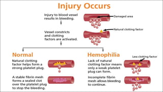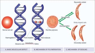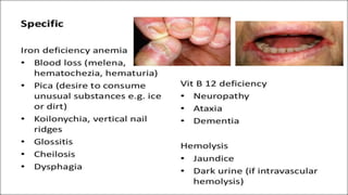 The document provides an overview of various types of anemia, including megaloblastic anemia and iron deficiency anemia, detailing their pathogenesis, clinical features, and stages. It also covers hereditary and acquired anemias, specifically sickle cell anemia and hemophilia, discussing their history, types, and symptoms. Additionally, thalassemia is addressed with information on its pathogenesis and signs.