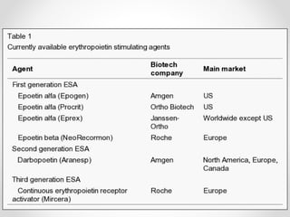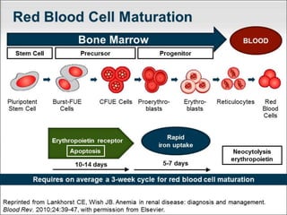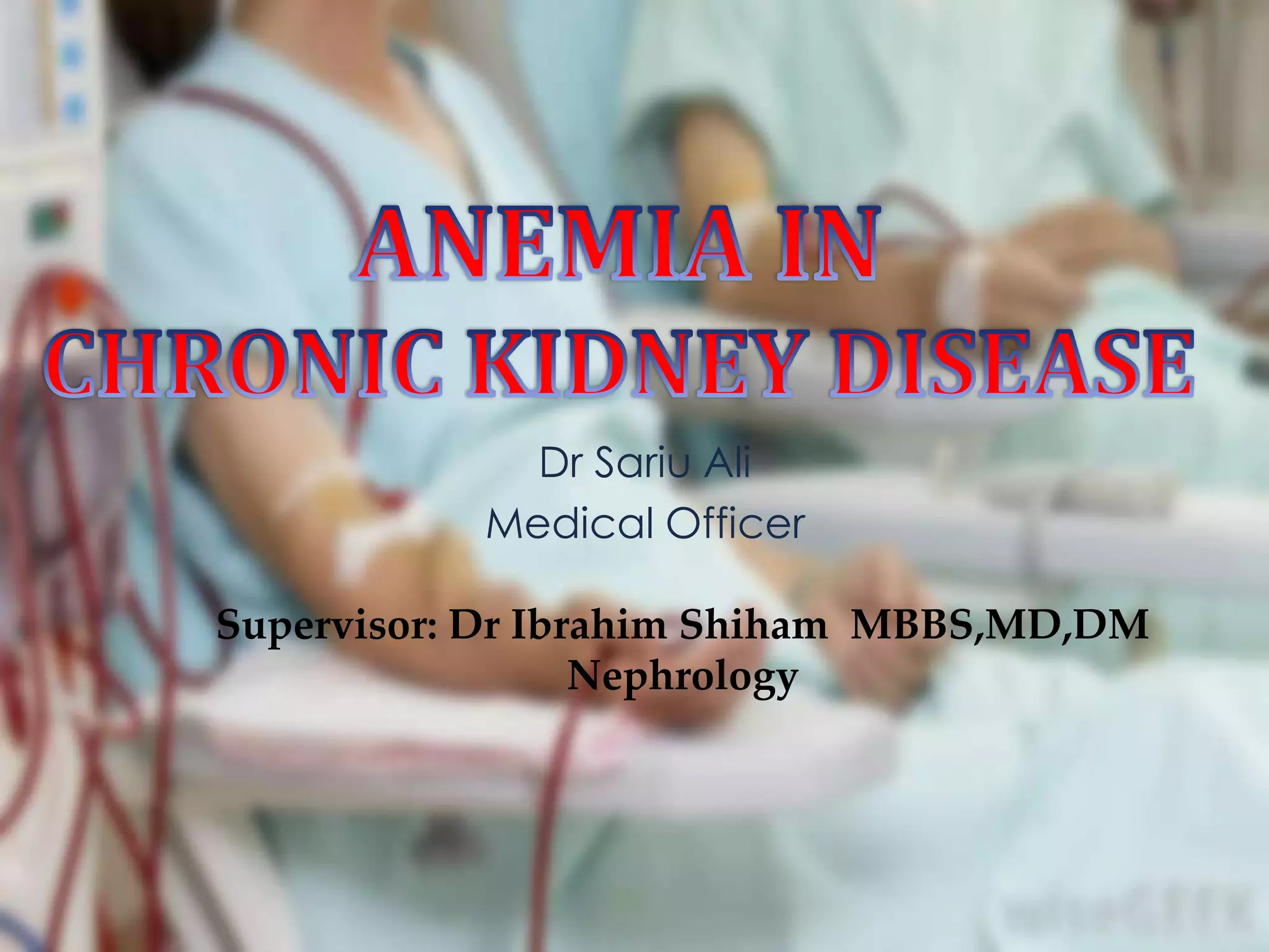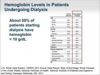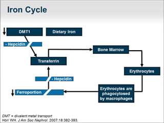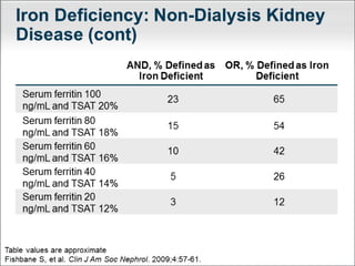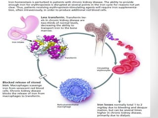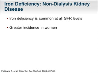 This document provides an overview of chronic kidney disease (CKD)-related anemia, including its definition, causes, effects, evaluation, and management. It defines the stages of CKD based on glomerular filtration rate and describes how anemia is defined for CKD patients based on hemoglobin levels. The main causes of anemia in CKD are identified as relative erythropoietin deficiency, iron deficiency, blood loss, shortened red blood cell lifespan, and inflammation. Evaluation involves testing hemoglobin, reticulocyte count, ferritin, transferrin saturation, and vitamins. Iron therapy is indicated based on ferritin and transferrin saturation levels, and intravenous iron is generally preferred for patients on dialysis