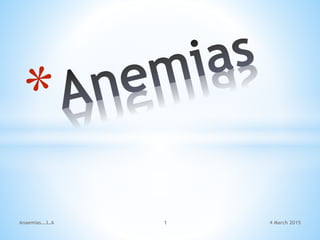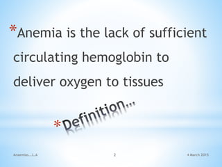 Anemia refers to a deficit of red blood cells or hemoglobin, resulting in decreased oxygen-carrying capacity. It can be caused by blood loss, nutritional deficiencies like iron deficiency, decreased red blood cell production, or increased red blood cell destruction. Treatment involves correcting the underlying cause, oral or parenteral iron supplementation, and managing symptoms. Pernicious anemia involves vitamin B12 deficiency and can cause megaloblastic anemia and neurological symptoms. It requires lifelong parenteral B12 replacement therapy. Folic acid deficiency can also cause megaloblastic anemia and is treated with oral folic acid supplementation. Aplastic anemia is a bone marrow failure disorder resulting in low blood cell counts.